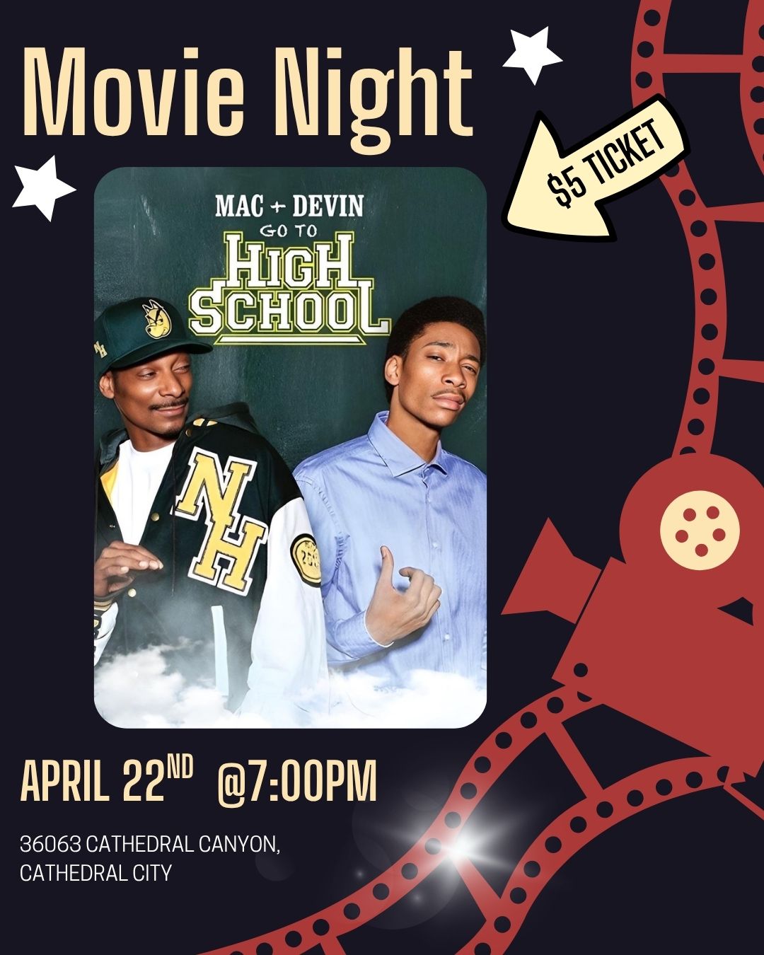$5 ticket = mocktail and first bag of popcorn is free! Come a bit early and visit the dab bar. Call 7603224481 for updates!